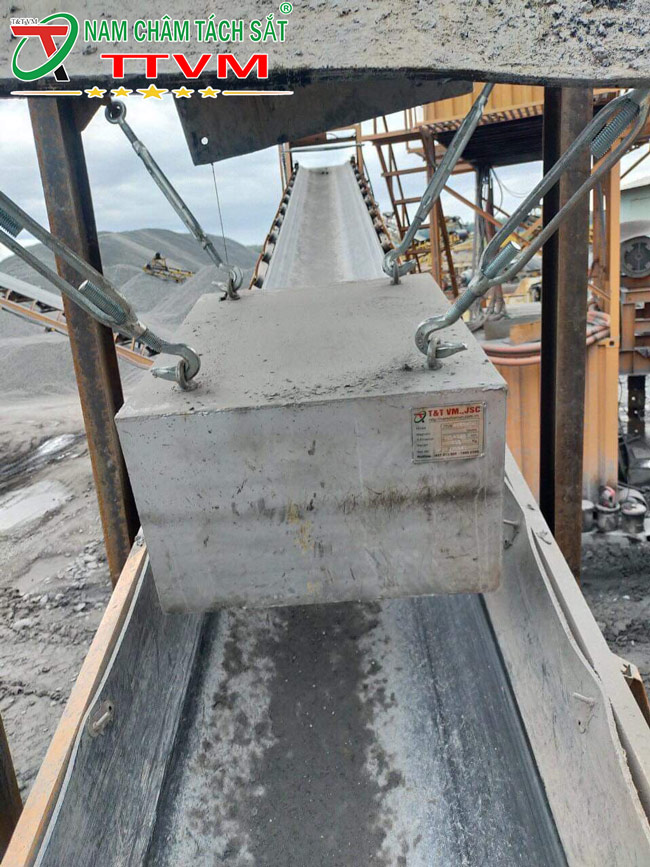 – Cách sử dụng: nam châm điện được thiết kế có kích thước bằng khổ băng tải và được treo trên bề mặt dây chuyền băng tải. Khi hỗn hợp vật liệu đi qua nếu có tạp chất sắt sẽ bị nam châm điện hút ngược lên trên. Từ đó loại bỏ được tạp chất sắt ra khỏi hỗn hợp vật liệu.